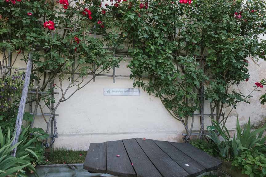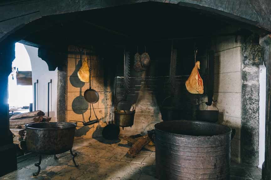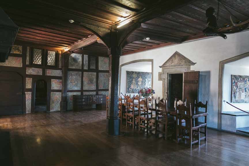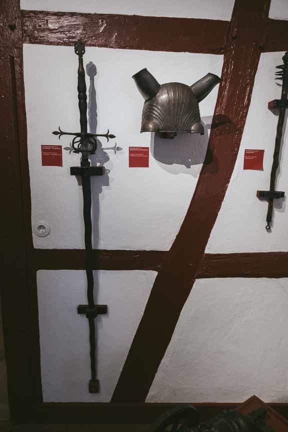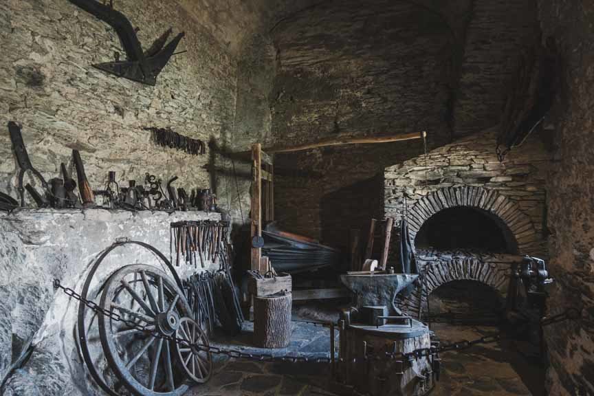 Am Bergfried vorbei, da man ihn nicht besichtigen kann, geht es zum Pferdestall/Folterkammer und Burgschmiede. Im Pferdestall sind noch die alten Deckenbalken von 1239 erhalten geblieben.