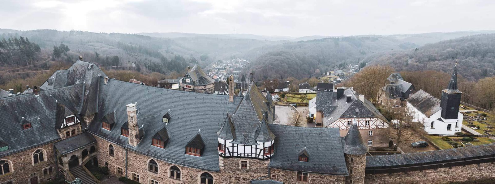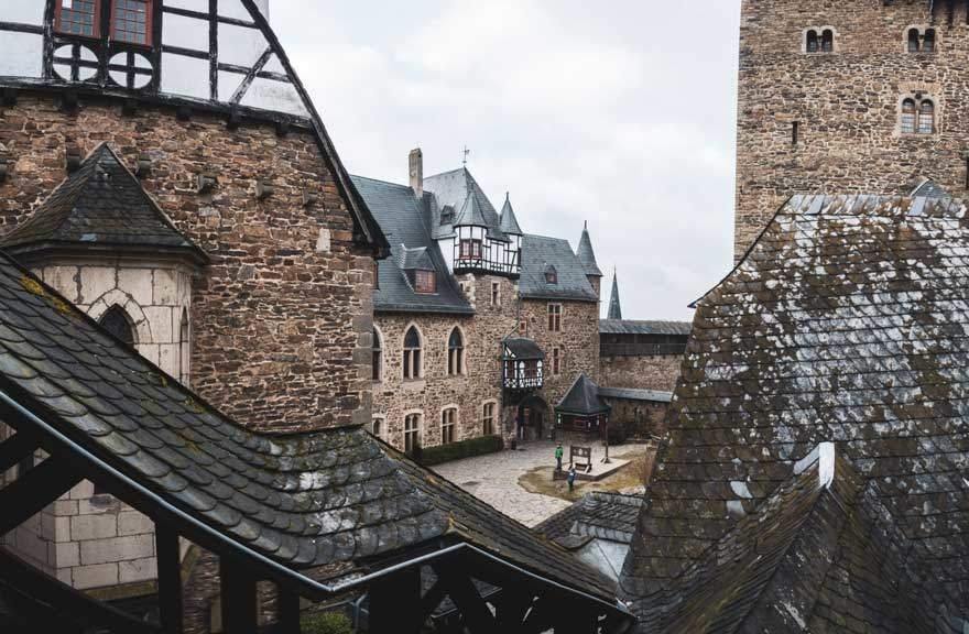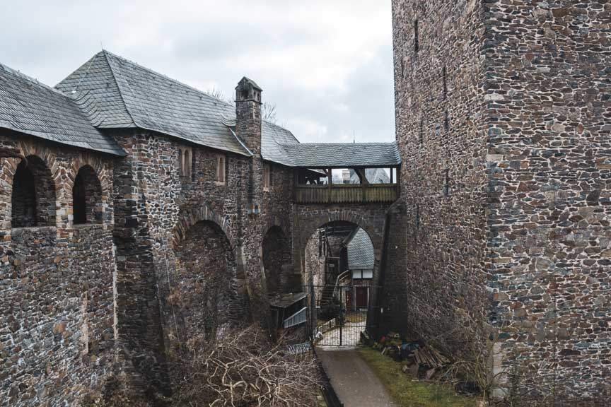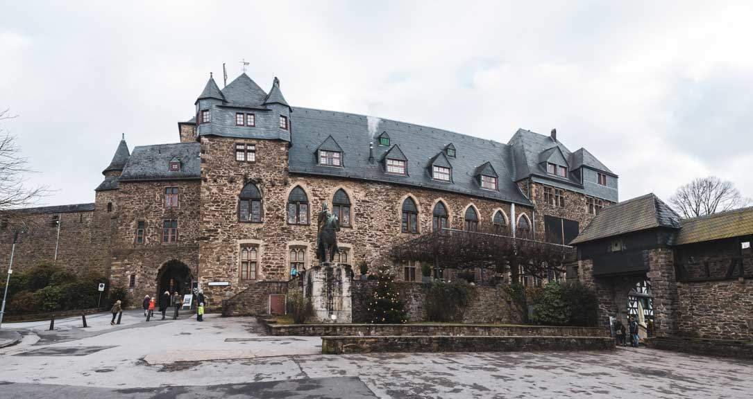Schon von weitem sieht man den stolzen Bergfried hoch oberhalb der Wupper. Auch wenn Schloss Burg rekonstruiert wurde, beeindruckt ihr Äußeres. Auf dem Weg zum Besucherzentrum muss man drei Tore durchlaufen, dort liegt dann auch der Schlossplatz. Hier finden häufig Open Air Events statt. Geht man jetzt durchs Burgtor, kommt man in die Kernburg.