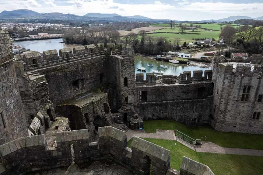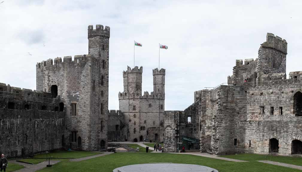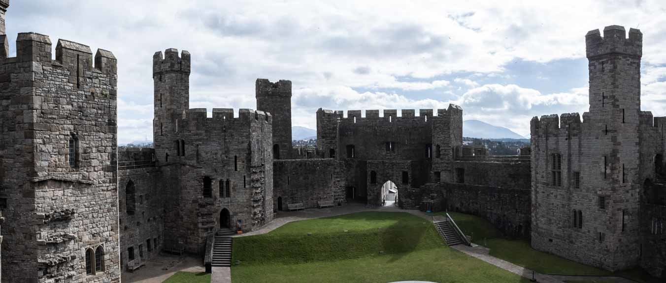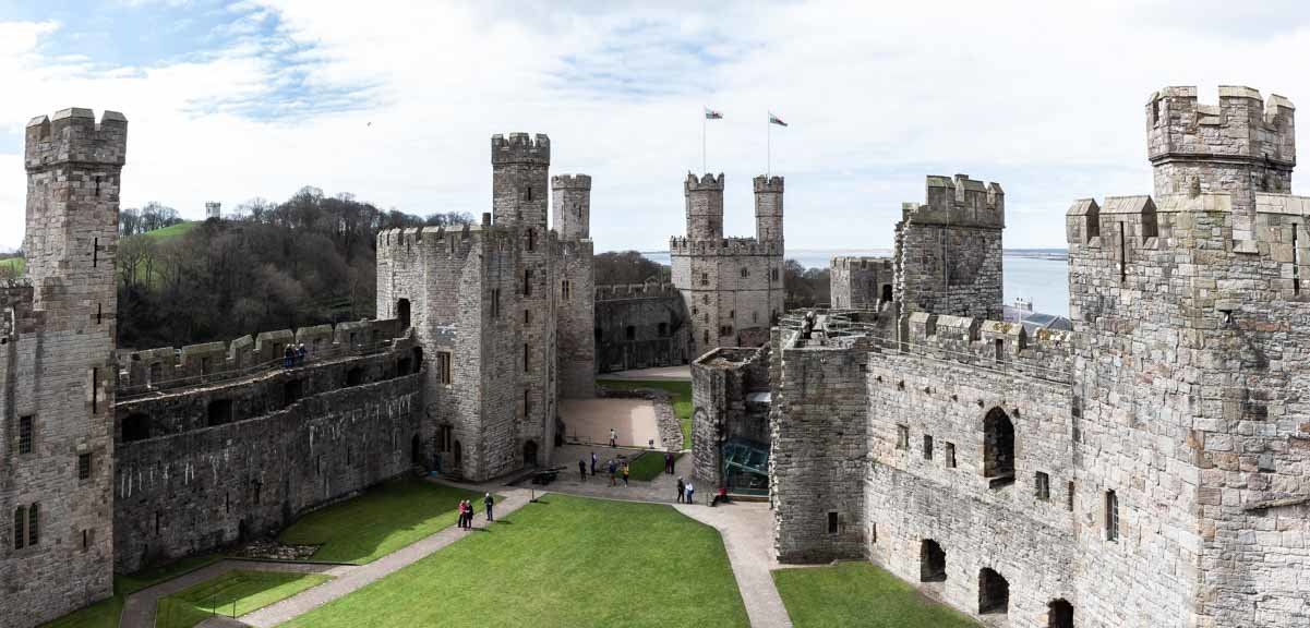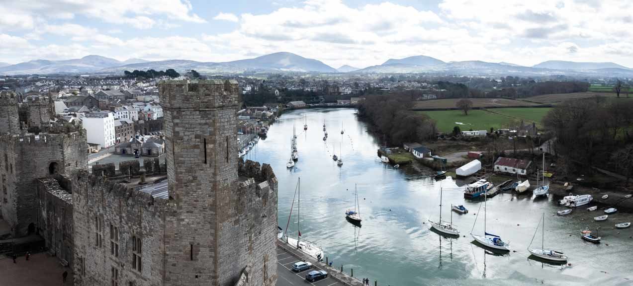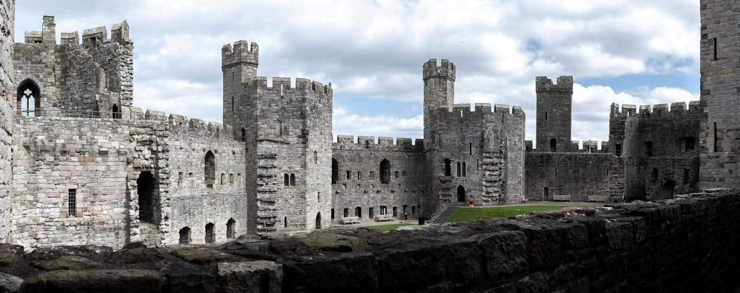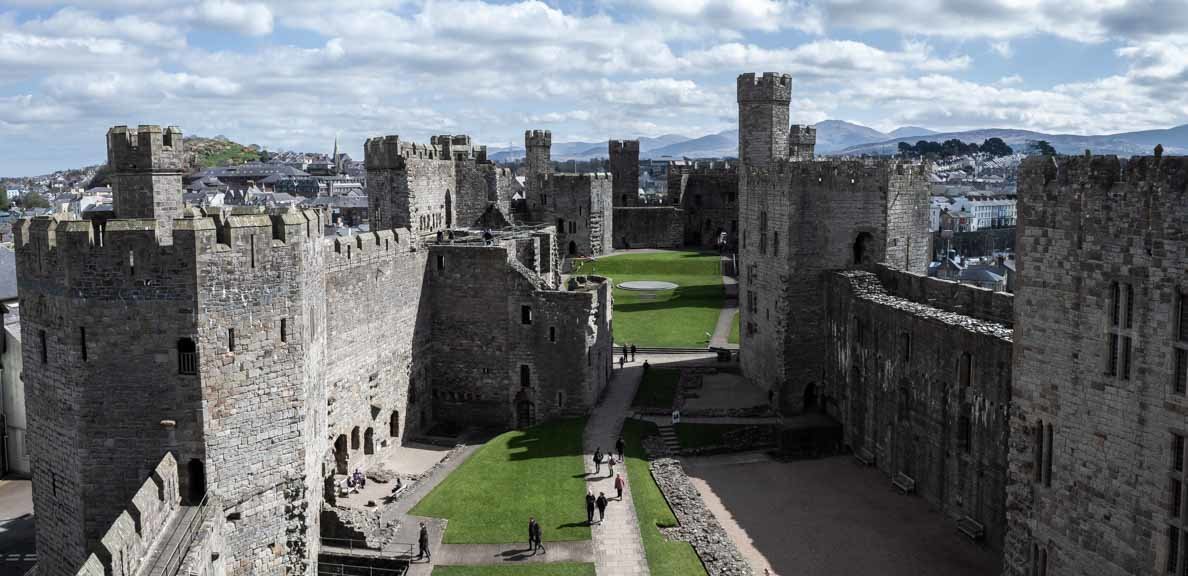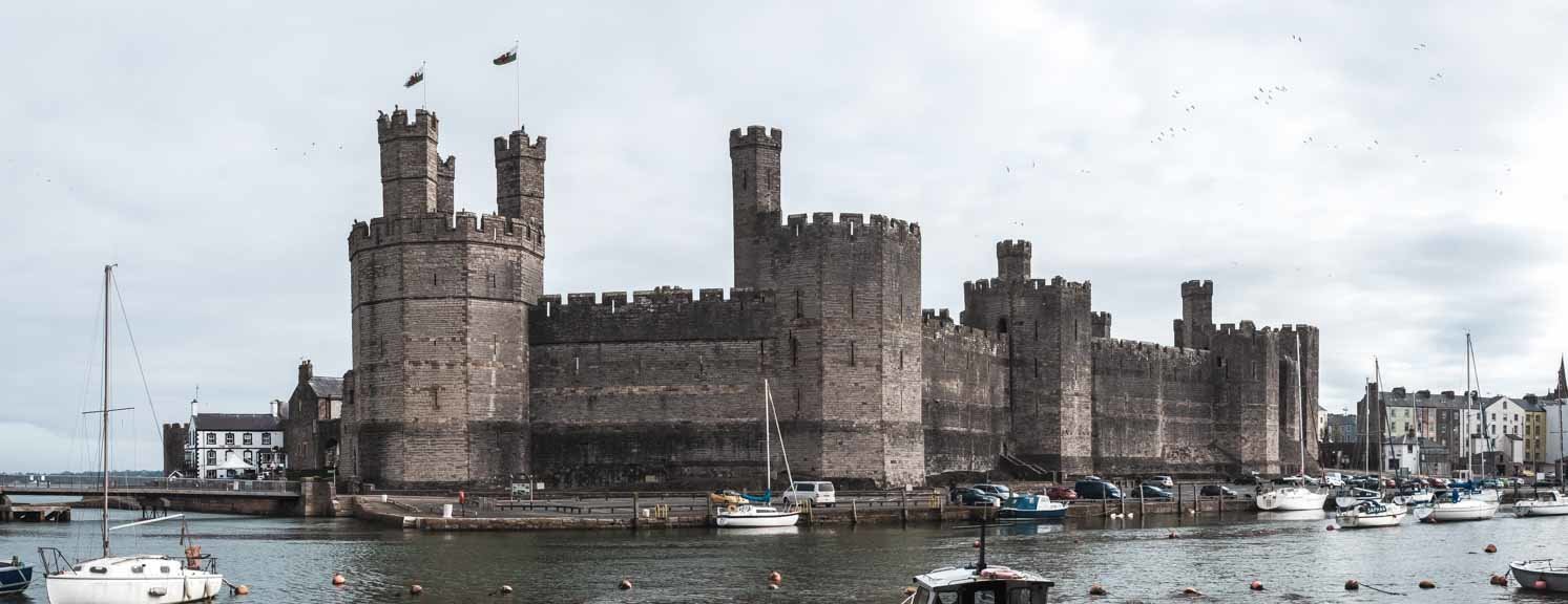 In früher Zeit stand hier eine römische Festung, dann eine normannische Motte. 1283 wurde Caernarfon Castle von König Edward I. während seiner Eroberung von Wales erbaut. Die Burg ist Teil des sogenannten „Eisenrings“, eines Netzwerks strategischer Festungen, das die englische Herrschaft über die Region sichern sollte. Edward wählte Caernarfon aufgrund seiner Lage am Fluss Seiont und der Nähe zur Menaistraße. Der Bau wurde von James of St. George, einem renommierten Architekten, geleitet. Das Design der Burg ist außergewöhnlich: Ihre polygonalen Türme und die farbigen Steinmuster wurden von den Mauern Konstantinopels inspiriert und sollten die Macht und den Anspruch der englischen Krone verdeutlichen. In dieser Zeit entstand auch der Ort Caernarfon.