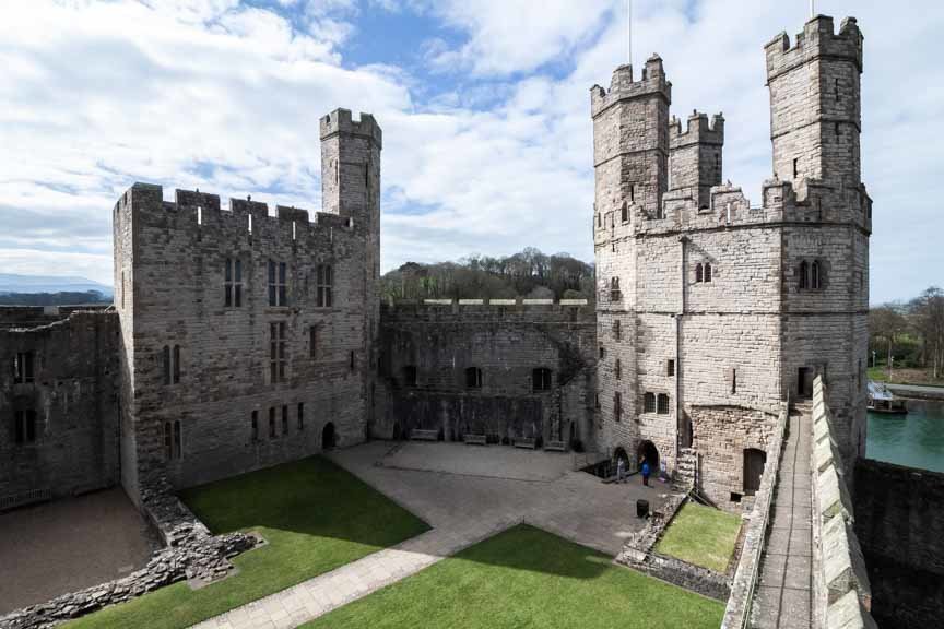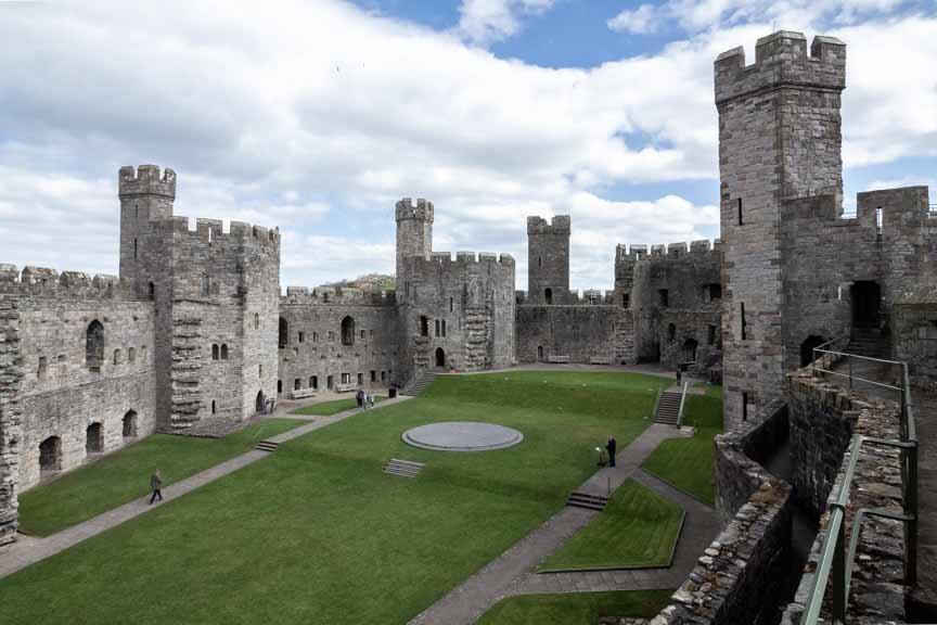 Schon von außen begreift man die monumentalen Ausmaße der Burg. Spaziert man durch den Innenhof, beeindruckt einen die 18 Meter hohe Ringmauer sowie die noch höheren achteckigen Türme, besonders der Eagle Tower als Hauptwohnturm. Er wird noch mit drei kleinen Türmchen geschmückt und ist insgesamt 39 m hoch. Bei ihm lohnt sich das Treppensteigen, da man von oben einen wunderschönen Rundblick hat. Beim Abgang sollte man die einzelnen Geschosse besichtigen, in denen interessante Ausstellungen untergebracht sind. Im ersten Obergeschoss stehen verschieden... große Figuren, die die Macht der verschiedenen Könige darstellen. Sehr interessant! Dort steht hinter Glas auch der Stuhl von Königin Elisabeth und der Hocker zum Knien bei der Investiture von Prinz Charles.
