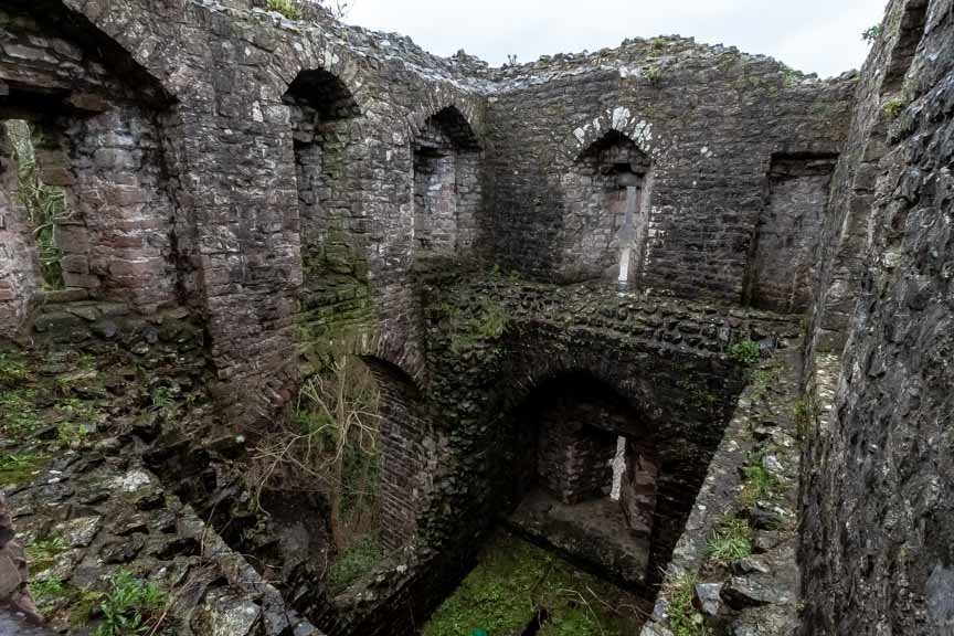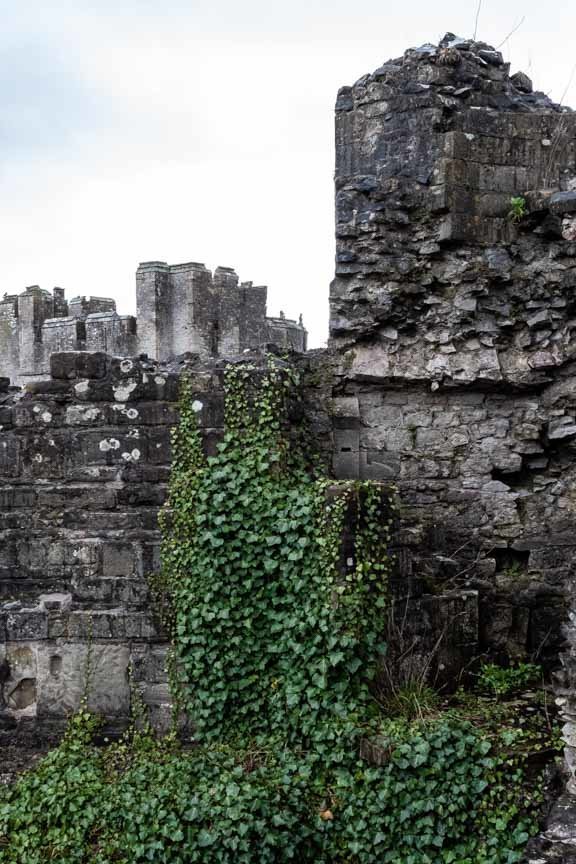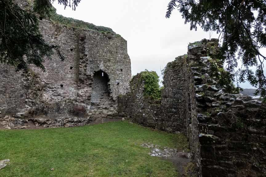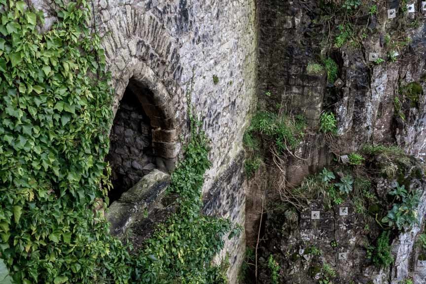 Der Martenstower enthielt früher luxeriös ausgestattete Wohnräume, in einer oberen Etage war eine Kapelle mit schönen Steinmetzarbeiten. Der Königsmörder Henry Marten hat 20 Jahre bis zu seinem Tod dort in Haft gelebt. Es war jedoch ein vergleichsweise komfortabler Aufenthalt....Durch die Mauern, der verschiedenen Abschnitte der Burg, hat man das Gefühl, in verschiedenen Burgen zu sein. Man geht durch Tore oder eine Gallery immer in den nächsten Abschnitt. Aber sie ist durch die Lage des Bergkamms über dem Fluss so langgezogen(ca. 250 Meter) gebaut worden. Sieht man die steilen Klippen hinab, kann man sich denken, dass sie von dort sehr geschützt war. Hier hat man auch einen schönen Ausblick aufs andere Ufer und die, heute durch den Regen, braune Wye. Man ist beeindruckt von den dicken Mauern und der Größe von Chepstow Castle. Hier würden wir uns gerne mal eines der Mittelalterfeste ansehen. Die Blumen und das Grün, dass die Mauern erobert haben, geben der Ruine ein freundlicheres Aussehen.