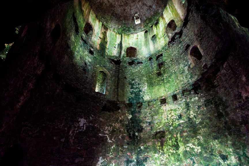 Der große Bergfried ist innen leer, leider sind alle 5 Etagen zerstört. So kann man von unten... die Steinkuppel sehen. Aber über eine Wendeltreppe kann man ihn erklimmen. Oben hat man einen wunderbaren Blick in die Umgebung und die Stadt.