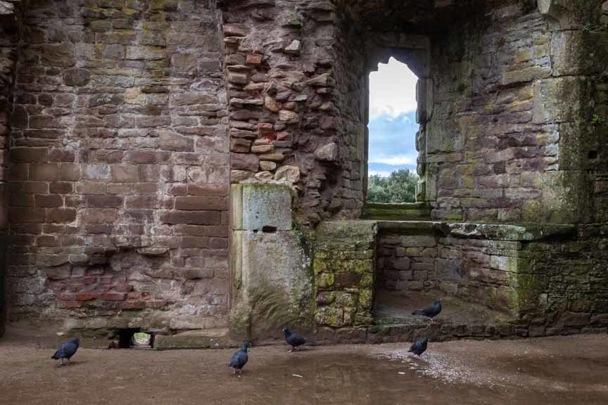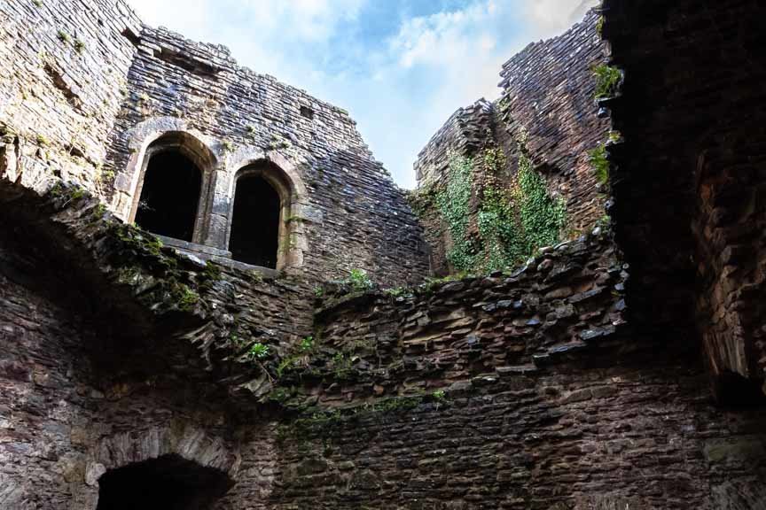 Die Außenwände der Wohnhalle zieren noch die schönen Tudorfenster, einschließlich dem großen Erkerfenster. Dort lag auch das Speisezimmer und das Schlafgemach des Burgherrn.